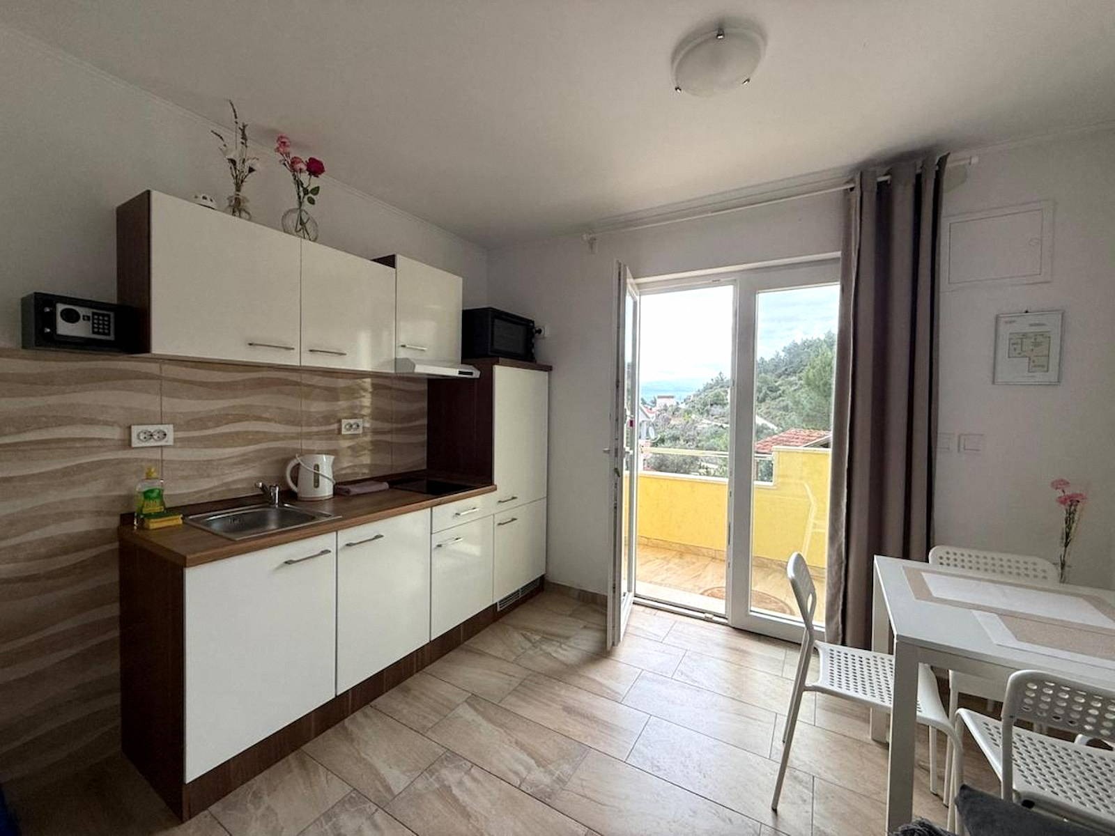 Každý apartmán má spálňu, kúpeľňu a obývaciu izbu s kuchyňou. Z balkónov sa naskytá krásny výhľad na more a celú zátoku Marina.